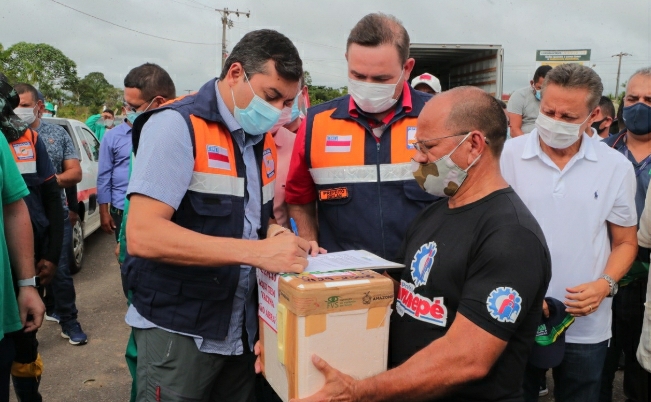 Eirunepé – Em Eirunepé, o governador entregou 1.293 cestas básicas, 20 toneladas de alimentos e gás de cozinha. Wilson Lima também repassou ao município 180 doses de vacinas contra a Covid-19 e pediu ao prefeito que a campanha de imunização não seja suspensa.