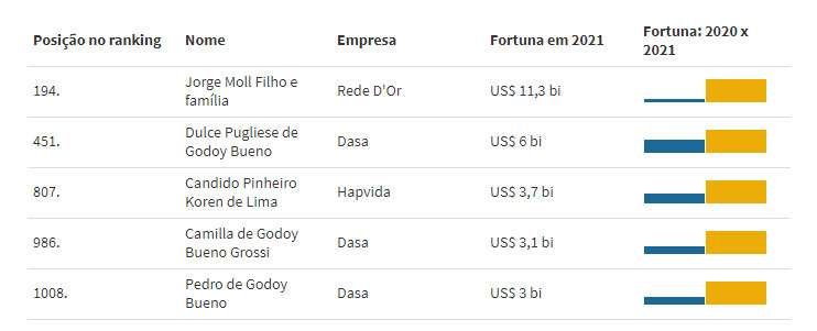 De acordo com o ranking, o médico e empresário Jorge Moll Filho e sua família foram os que mais enriqueceram de um ano para o outro no setor de saúde brasileiro: o patrimônio deles cresceu de US$ 2 bilhões em 2020 para US$ 11,3 bilhões em 2021. Moll Filho é fundador da Rede D’Or, de hospitais e laboratórios, que fez uma oferta de ações (IPO) no final de 2020, no valor de R$ 11,4 bilhões. Foi o maior IPO da Bolsa desde 2013.