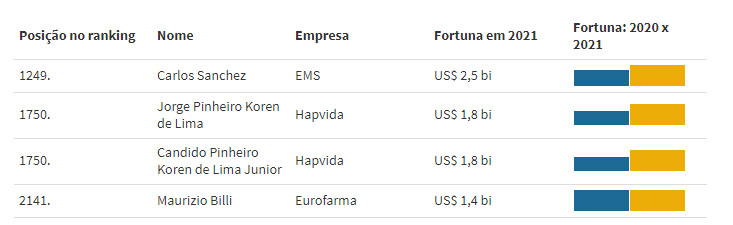 Completam a lista os donos da Hapvida, de planos de saúde, e das farmacêuticas EMS e Eurofarma. No final de fevereiro, a Hapvida e a NotreDame Intermédica anunciaram uma fusão, que resultou em uma companhia com mais de R$ 110 bilhões de valor de mercado.