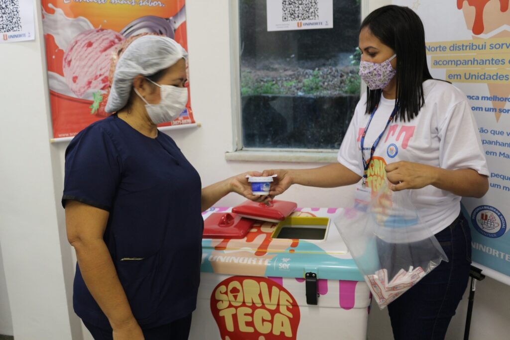 Pacientes, acompanhantes e profissionais de saúde da Fundação Centro de Controle de Oncologia do Amazonas (FCecon) receberam a visita da Sorveteca da UNINORTE – Centro Universitário do Norte. A ação de responsabilidade social ocorreu nesta quinta-feira, dia 6, com a distribuição de 120 sorvetes na unidade de saúde. A iniciativa teve o apoio da Sorvetes Toya, que disponibilizou as sobremesas para a doação. Segundo a coordenadora de Responsabilidade Social da UNINORTE, Gilmara Teles, a doação é um gesto de carinho para os pacientes que estão em tratamento e seus acompanhantes, e, também, de respeito ao trabalho dos profissionais de saúde.
