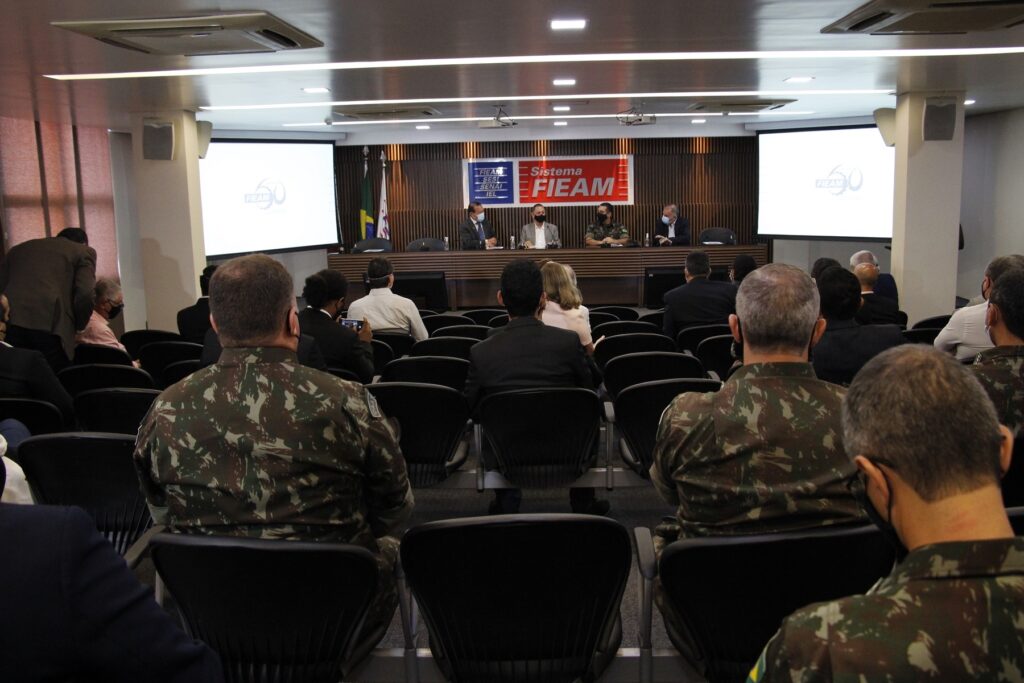 A Federação das Indústrias do Estado do Amazonas (FIEAM) e o Comando Militar da Amazônia (CMA) realizaram nesta quinta-feira, 29, palestra com o general de Divisão R1, Angelo Kawakami Okamura, que apresentou o Sistema Defesa, Indústria e Academia de Inovação do Exército Brasileiro (SisDIA), programa de abrangência nacional, coordenado pelo Exército Brasileiro, que tem por objetivo fomentar o desenvolvimento de novas tecnologias para a Defesa, a partir das relações entre universidades, empresas e governo.