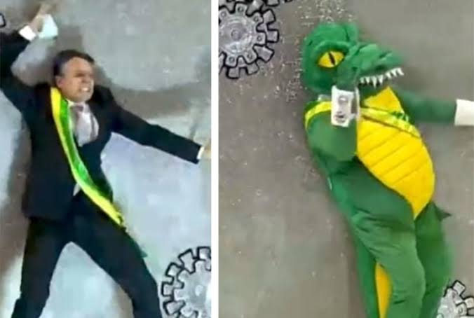 O desfile na madrugada deste domingo (24) relembrou uma frase dita pelo presidente em dezembro de 2020, quando ele afirmou que não se vacinaria por não confiar nas vacinas e que poderia ter algum efeito colateral, tipo, virar um jacaré.