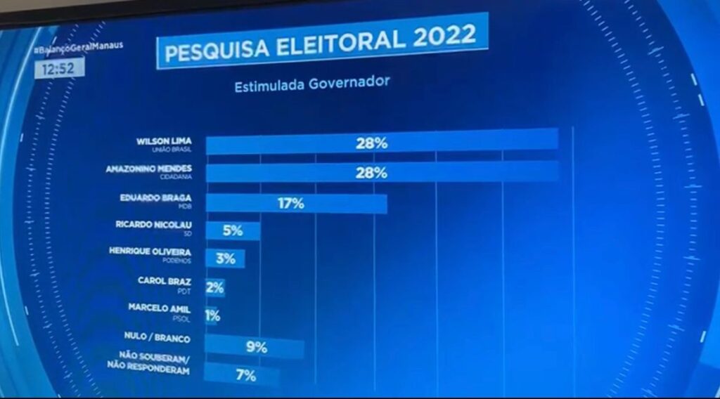 O governador Wilson Lima (União Brasil) e o ex-governador Amazonino Mendes (Cidadania) estão empatados na corrida pelo governo do Amazonas nos cenários espontâneo e estimulado. Os dados são de levantamento feito pela Real Time Big Data para a Record TV.