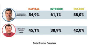 O levantamento da Pontual Pesquisas sobre a votação no segundo turno para o governo de Amazonas indica o governador Wilson Lima (União Brasil) com 58,0%