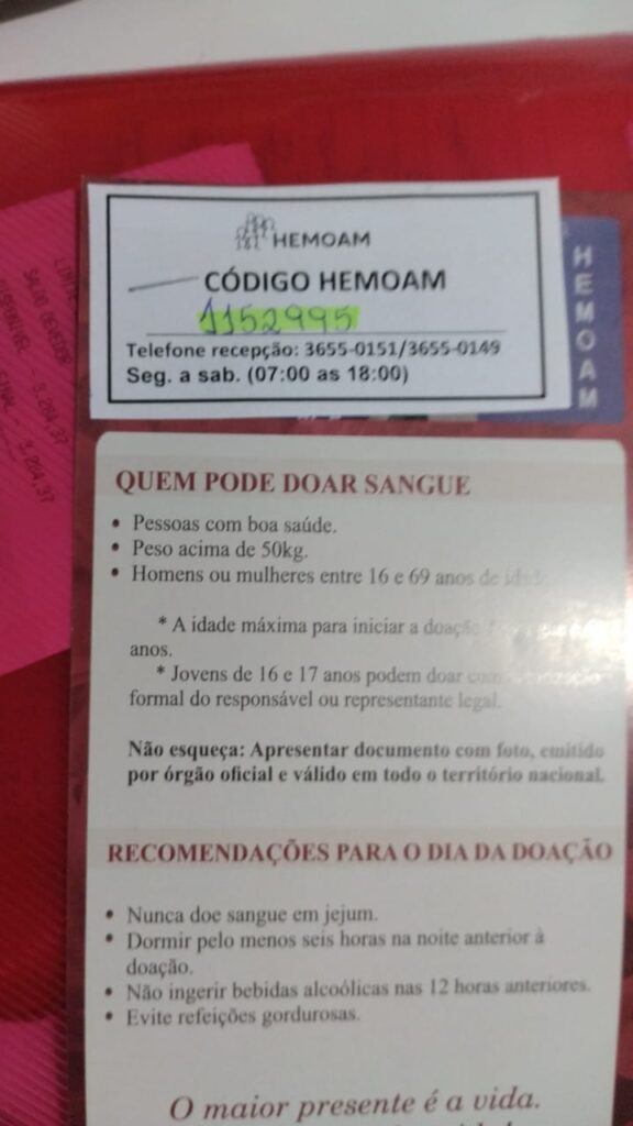 De acordo com a idosa, devido as várias transfusões de sangue que é necessário fazer durante o tratamento foi solicitado que as bolsas sejam repostas com urgência. Para quem quiser doar sangue deve procurar a Fundação de Hematologia e Hemoterapia do Amazonas (Hemoam) de segunda a sábado a a partir das 7h às 18h e fornecer o código 115299.