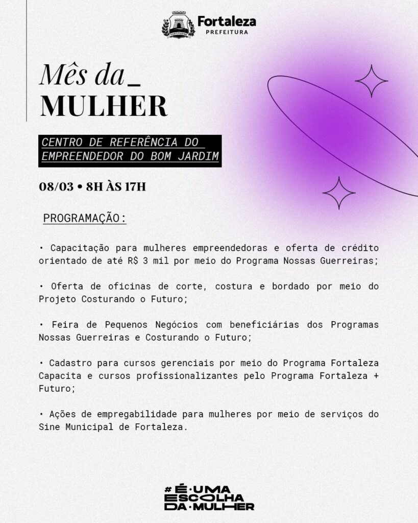A Prefeitura de Fortaleza realiza, por meio da Secretaria Municipal do Desenvolvimento Econômico (SDE), uma programação especial alusiva ao Dia da Mulher. Nesta quarta (08/03), o Centro de Referência do Empreendedor (CRE) do Bom Jardim (Rua Oscar Araripe, 1030) recebe, das 8h às 17h, atividades gratuitas e abertas ao público feminino.