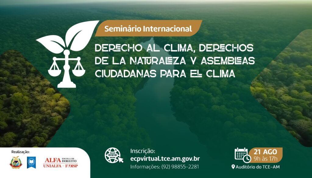 No próximo dia 21 de agosto, às 9h, o Tribunal de Contas do Amazonas (TCE-AM) será palco do Seminário Internacional “Derecho al Clima, Derechos de la Natureza y Asembleas Ciudadanas para el Clima”, que contará com a presença dos ministros André Mendonça, do Supremo Tribunal Federal (STF), e Reynaldo Soares da Fonseca, do Superior Tribunal de Justiça (STJ), além de notórias personalidades internacionais do direito.
