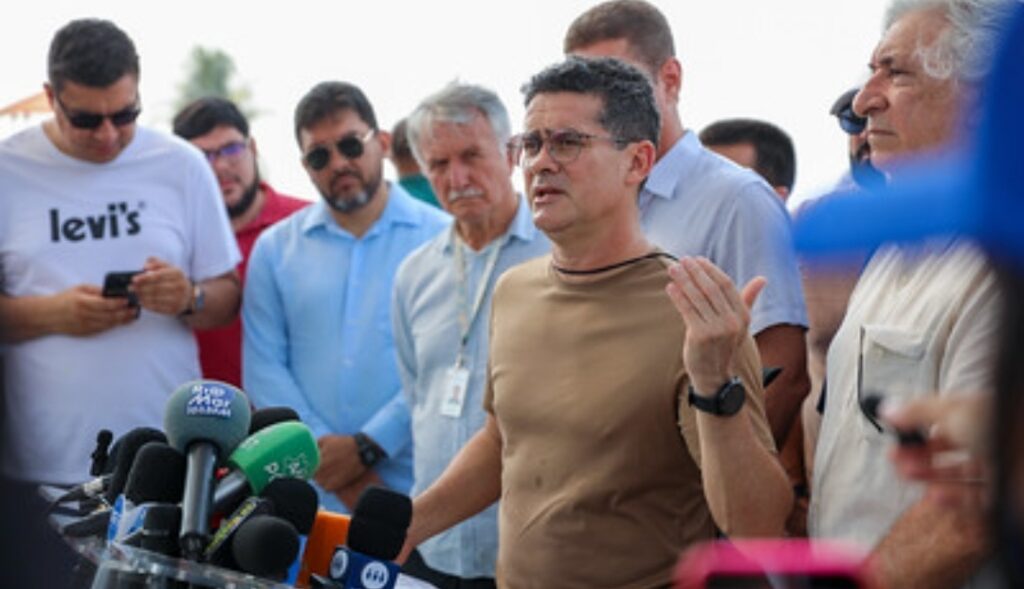 O prefeito de Manaus, David Almeida, ao lado do vice-prefeito e chefe da Casa Civil, Marcos Rotta, anunciou, na manhã desta segunda-feira, 2/10, a interdição por 90 dias da praia do complexo turístico Ponta Negra, para o banho, em razão da vazante que atinge o Estado, em 2023. O chefe do Executivo municipal também anunciou outras iniciativas como doação de cestas básicas e água potável para mais de 6,8 mil moradores de comunidades ribeirinhas que sofrem os efeitos da seca severa.