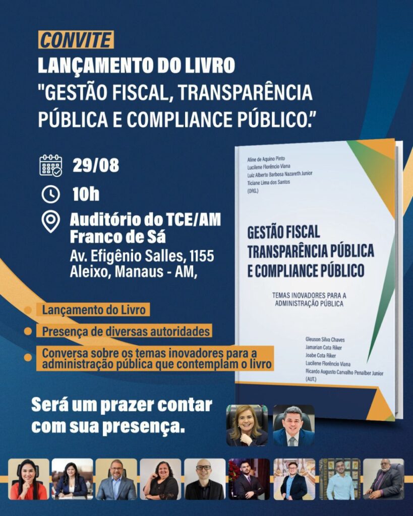 O livro intitulado ‘Gestão Fiscal, Transparência Pública e Compliance Público’ será lançado nesta quinta-feira, 29/8, no Auditório Franco de Sá, situado no Tribunal de Contas do Estado do Amazonas (TCE-AM). A obra é fruto das experiências de sucesso de gestores públicos municipais especializados.