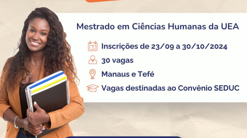 A Universidade do Estado do Amazonas (UEA) está com inscrições abertas para o mestrado em Ciências Humanas, com ingresso previsto para 2025. O curso oferece um total de 30 vagas em Manaus e Tefé (distante 523 quilômetros de Manaus), sendo 10 vagas exclusivas para professores e/ou pedagogos da Secretaria de Educação e Desporto Escolar (Seduc/AM). Para ingressar, os candidatos devem se inscrever até as 23h59 do dia 30 de outubro, no link: https://selecao2.uea.edu.br/?dest=info&selecao=10683.