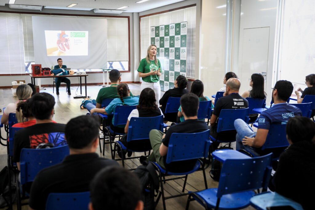Para contribuir com a garantia do atendimento básico a casos de parada cardiorrespiratória com uso de Desfibriladores Externos Automáticos (DEA), o programa “UEA Cardio Protegida”, da Universidade do Estado do Amazonas (UEA), ofereceu, na manhã de quinta-feira (0l7/11), o curso de capacitação “Suporte Básico de Vida”. A aula ocorreu no auditório da Academia Stem da Escola Superior de Tecnologia, localizado na avenida Darcy Vargas, 1.200, Parque Dez de Novembro.