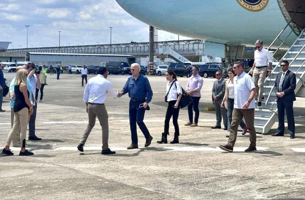 Joe Biden desembarcou em Manaus por volta das 12h30, no Aeroporto Internacional Eduardo Gomes, zona oeste, após cumprir agenda no Peru. Acompanhado da embaixadora dos Estados Unidos no Brasil, Elisabeth Frawley Bagley, o governador Wilson Lima cumprimentou o presidente norte-americano e agradeceu pela visita ao Amazonas, reforçando as relações diplomáticas entre os países.