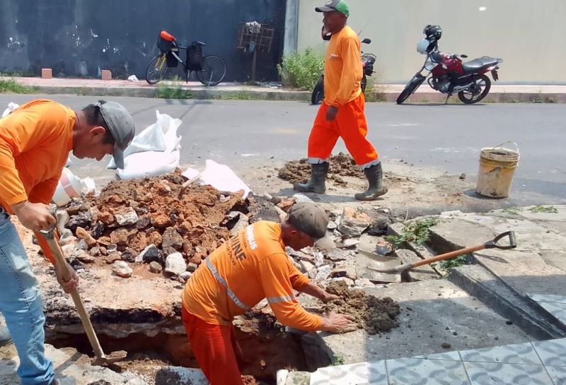 A Prefeitura de Manaus, por meio da Secretaria Municipal de Infraestrutura (Seminf), trabalha de forma emergencial para fechar uma cratera que se abriu na travessa Evaldo Braga, no conjunto Jardim de Versalles, bairro Planalto, zona Centro-Oeste, após os tubos da antiga rede de drenagem terem desanelado.