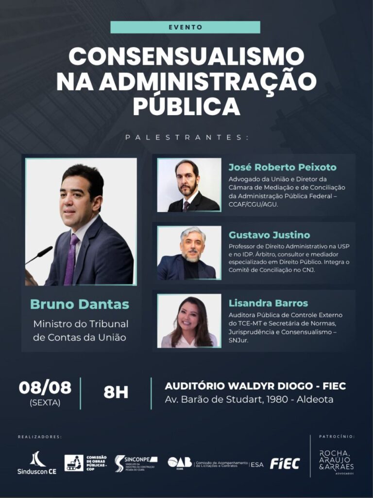 No dia 8 de agosto (sexta-feira), a partir das 8h30, o Auditório Waldyr Diogo, na FIEC, será palco de um dos mais relevantes debates jurídicos do ano no Ceará: o evento “Consensualismo na Administração Pública 2025”. A iniciativa é promovida pelo Sinduscon Ceará, por meio da sua Comissão de Obras Públicas, em parceria com o Sinconpe, a OAB-CE e a FIEC.