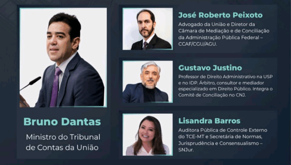 Entre os palestrantes confirmados está o ministro do Tribunal de Contas da União (TCU), Bruno Dantas, um dos maiores expoentes da pauta no Brasil. Também participam José Roberto Peixoto, advogado da União e diretor da Câmara de Mediação e Conciliação da Administração Pública Federal (CCAF/CGU/AGU); Gustavo Justino, professor da USP e especialista em Direito Público; e Lisandra Barros, auditora pública do TCE-MT e secretária de Normas, Jurisprudência e Consensualismo da SNJur.